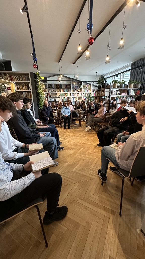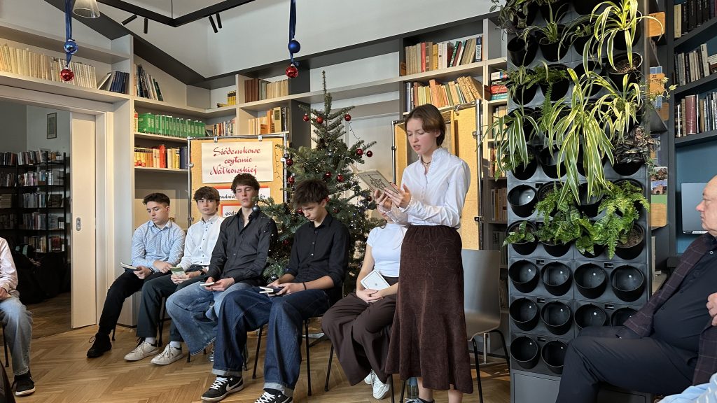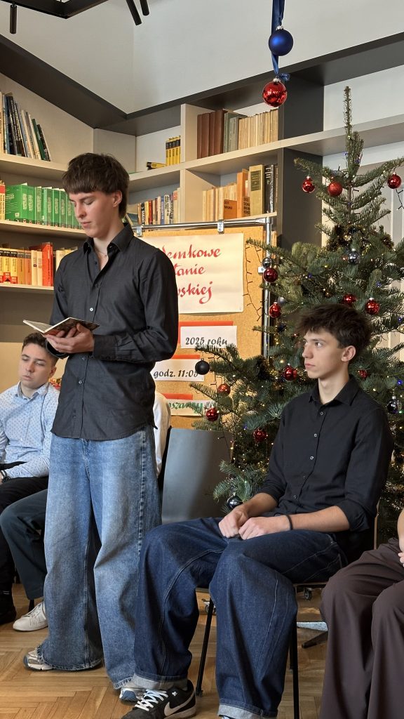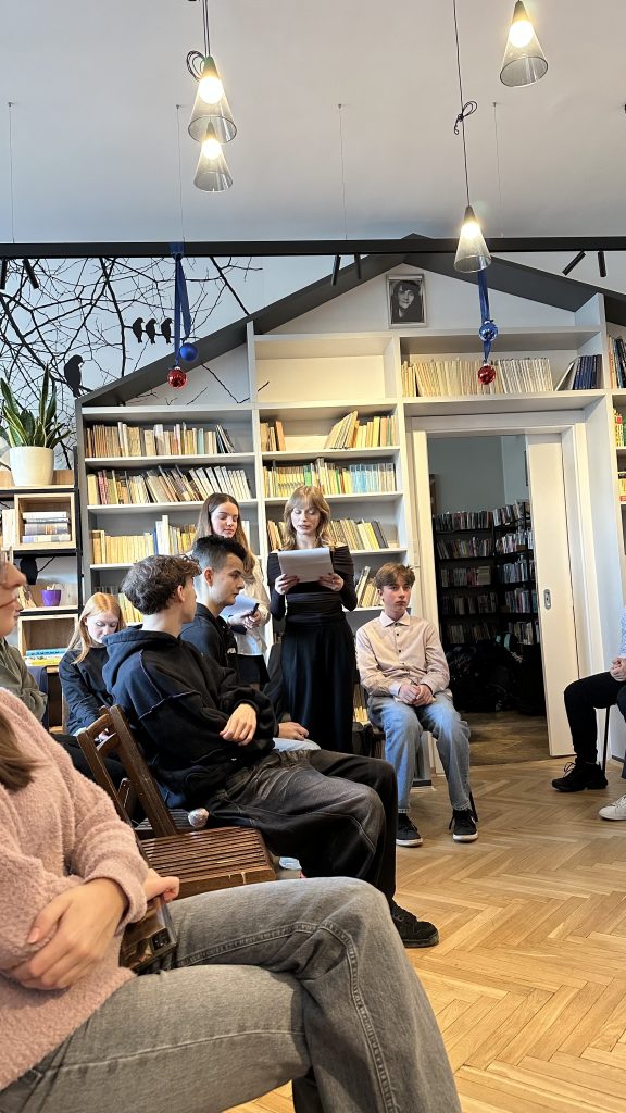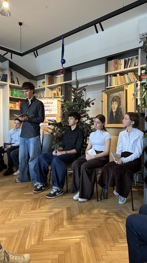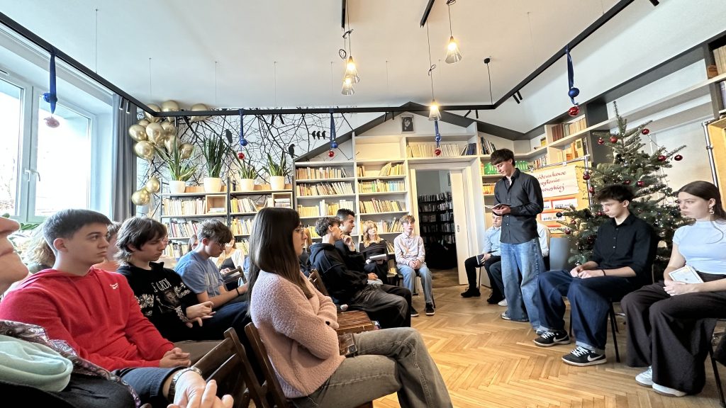 Po wykładzie Pana Ornata uczniowie z klas humanistycznych zaprezentowali wykonane przez siebie prace. Dziewięć zespołów wprowadziło nas w historię i kulturę żydowską, zaprezentowało sylwetki osób lub całych rodzin, które z narażeniem życia pomagały ofiarom Zagłady. Uczniowie z klas trzecich przedstawili także piękne zdjęcia upamiętniające Żydów w Podgórzu.