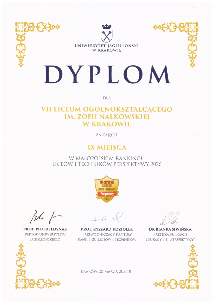 Z radością informujemy, że dnia 20 marca w auli Collegium Novum Uniwersytetu Jagiellońskiego nasza szkoła została uhonorowana prestiżową nagrodą Małopolskiego Rankingu Liceów i Techników Perspektywy 2026. Podczas uroczystej gali wyróżnionych zostało 10 najlepszych liceów ogólnokształcących, które zostały wyłonione w rankingu przygotowywanym przez Fundację Edukacyjną „Perspektywy”.