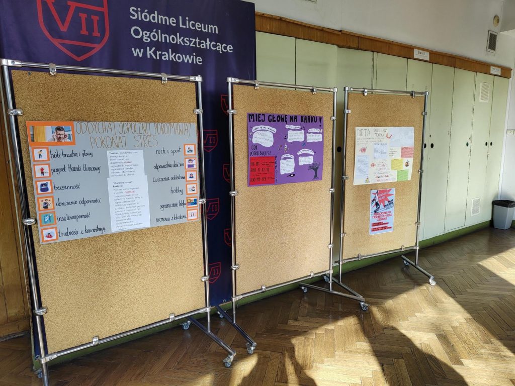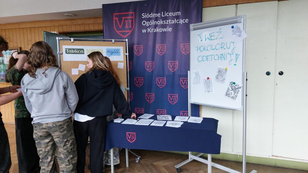 Czwartek przebiegał pod hasłem profilaktyki zdrowia psychicznego. Na szkolnym korytarzu wywieszono plakaty dotyczące sposobów radzenia sobie ze stresem oraz dbania o dobrostan psychiczny. Uczniowie mieli możliwość wpisywania pozytywnych sentencji na „Tablicy dobrych myśli” oraz korzystania z kolorowanek antystresowych dostępnych dla wszystkich.