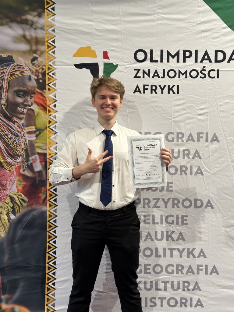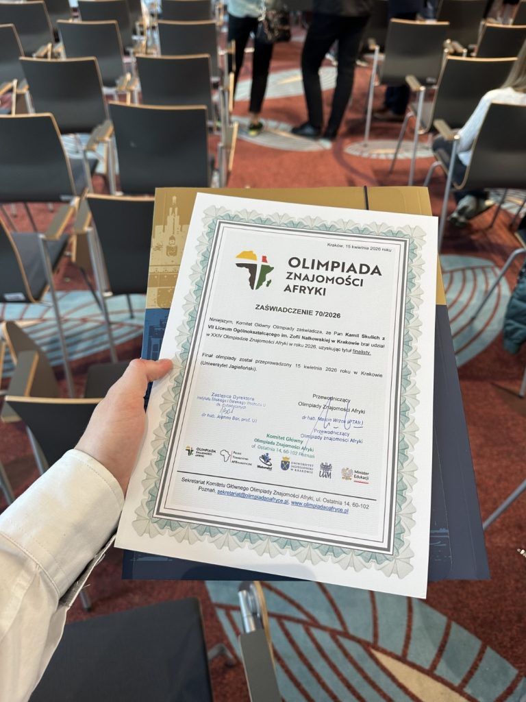 Z przyjemnością informujemy, że uczeń klasy 4e, Kamil Skulich, został finalistą Olimpiady Znajomości Afryki. Kamil wziął udział w finale tej prestiżowej olimpiady, który odbył się 15 kwietnia 2026 r. w Krakowie.