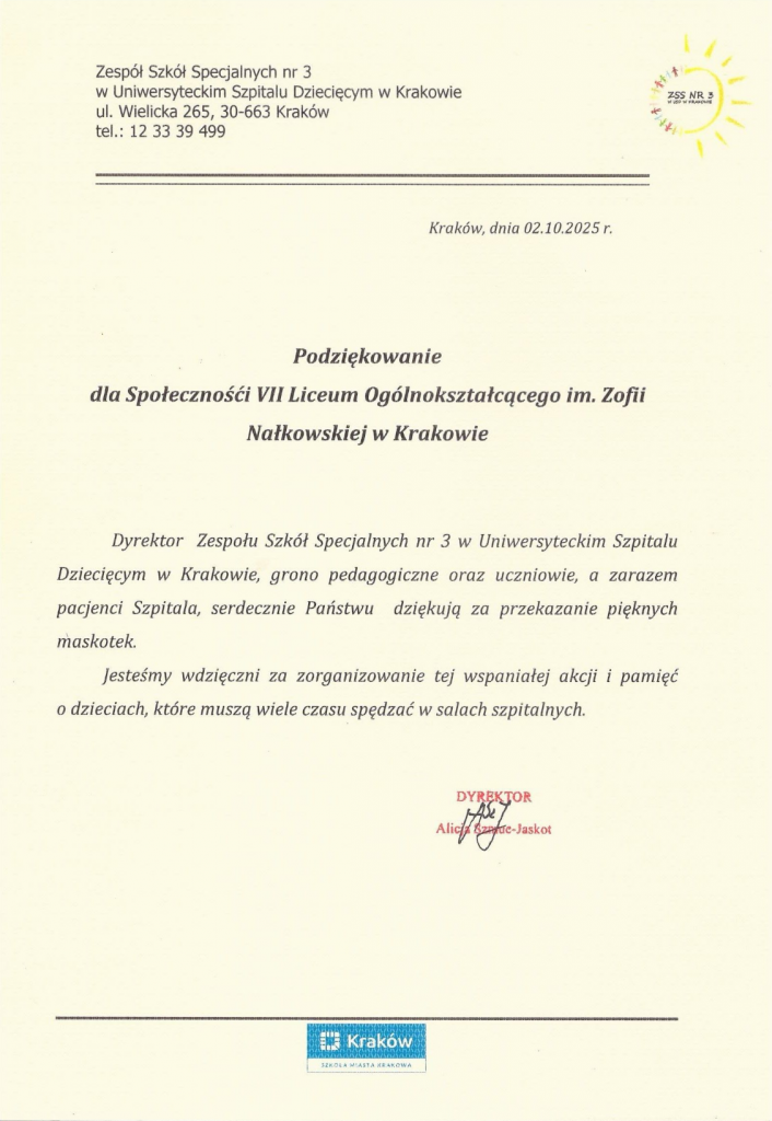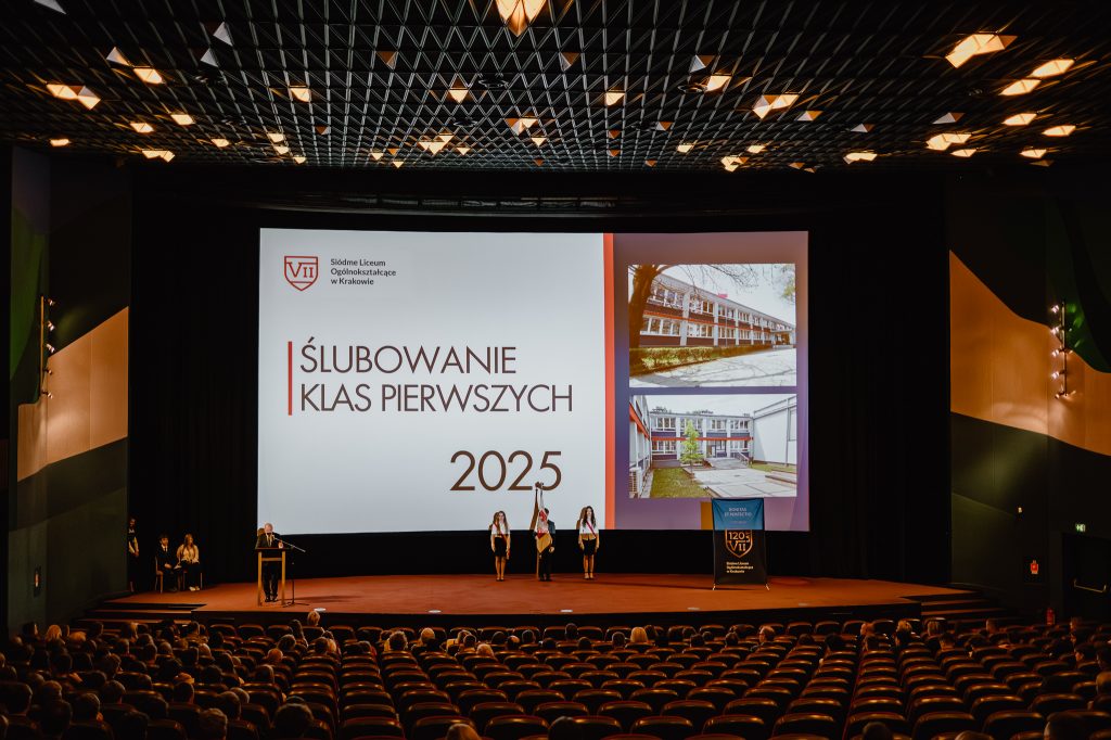 29 października 2025 r. społeczność VII Liceum Ogólnokształcącego świętowała uroczyste ślubowanie klas pierwszych. Tegoroczna ceremonia odbyła się w przestrzeni Kina Kijów, co dodało wyjątkowego charakteru.Już od pierwszej chwili atmosfera była podniosła, ale i pełna życzliwej energii. Dwoje pierwszoklasistów, prowadzących uroczystość z ogromną swobodą i kulturą, przywitało zgromadzonych gości, uczniów i nauczycieli. Następnie głos zabrał Dyrektor szkoły, Pan Wojciech Zagórny, który przypomniał, że ślubowanie to nie tylko tradycja, lecz moment symbolicznego wejścia do licealnej wspólnoty.W imieniu Rady Rodziców przemówiła Pani Magdalena Koźbiał, życząc nowym uczniom, aby nadchodzące lata stały się dla nich czasem odkrywania siebie i świadomego kształtowania własnej drogi. Najważniejszym punktem uroczystości było ślubowanie. Pierwszoklasiści, stojąc ramię w ramię, wypowiadali słowa pełne zobowiązań i ideałów. Padły m.in. takie deklaracje jak „kierować się zasadami humanizmu” czy „godnie reprezentować dobre imię szkoły”. Te krótkie frazy brzmiały jak obietnica – i jak zapowiedź tego, jacy chcą być jako młodzi ludzie.Po części oficjalnej ogłoszono wyniki Wielkiego Konkursu o Historii Szkoły „Siódemka wczoraj i dziś”. Radość laureatów i gratulacje kolegów podkreśliły, że licealna przygoda zaczyna się dla nich nie tylko od ślubowania, ale także od pierwszych sukcesów. Uroczystość zakończył wspólny seans filmu „Chopin, Chopin!” w reżyserii Michała Kwiecińskiego. To pełna emocji opowieść o artyście, którego twórczość wciąż inspiruje – idealne domknięcie dnia pełnego refleksji, kultury i wartości.Serdecznie dziękujemy Pani profesor Magdalenie Lampie-Baczyńskiej oraz Panu profesorowi Kacprowi Szewczykowi za przygotowanie uroczystości, za zaangażowanie, troskę i stworzenie wyjątkowej atmosfery dla naszych pierwszoklasistów.